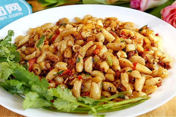 有的女人手艺精细,还能把麻食做成螺旋状或条形状。做好之后,烧开锅里水倒下去煮熟,捞出来沥干水,舀上另做好的荤汤或素汤,也可加炒好的菜料干拌着去吃,筋道光滑,味香爽口,少嚼快咽,象似吃凉粉鱼一样流畅,食味其乐无穷,十分惬意!