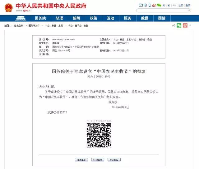 关于申请设立“中国农民丰收节”的请示收悉。同意自2018年起,将每年农历秋分设立为“中国农民丰收节”。具体工作由你部商有关部门组织实施。